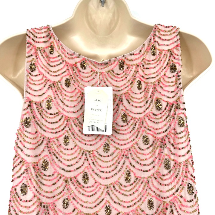 Elegant pink shift dress with gold scallop hem, intricate beading, and a flattering fit. New with tags.